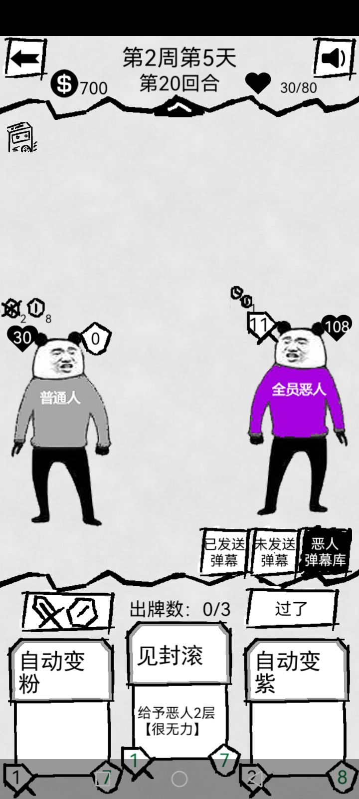 虽然是几年前的游戏,但是平衡性做的一坨,我有理由怀疑作者有没有像新手从头玩过一次,我还是第一次看见既给对手堆buff又增强它们的数值,我只有那点金币怎么分配给买物品,买卡,增强卡数值,补血还有减少对手的buff。我真的很少见玩家无法通过类似永久性(指从开局就一直有)被动的方法给自己上buff和给对手上debuff的。然后对手随着时间不仅攻击生命大增,还不断给我debuff,给他自己buff。那我问你,我怎么用那点金币抗衡数值和debuff以及它的buff?开局选卡也是坑,要不别随机,要不优化随机。那种无效,自残,被攻击次数+1和受伤害翻倍谁tm受得了,我又没有1k血。卡牌差点它要是一直补血我都耗不死。这游戏给玩家的感觉就是我像那个恶龙,不断有buff和数值逆天的勇者讨伐消耗我,还一直给我上debuff,我耗尽力气消除一个又来一个。弹幕那个恶人?我看作者把玩家当恶人整。弹幕文化现在不断发展而且传播广泛,你这个游戏可能可以更好的,只可惜不知道为什么早早停更,而且平衡性一坨,改过了也白搭,还是那样
