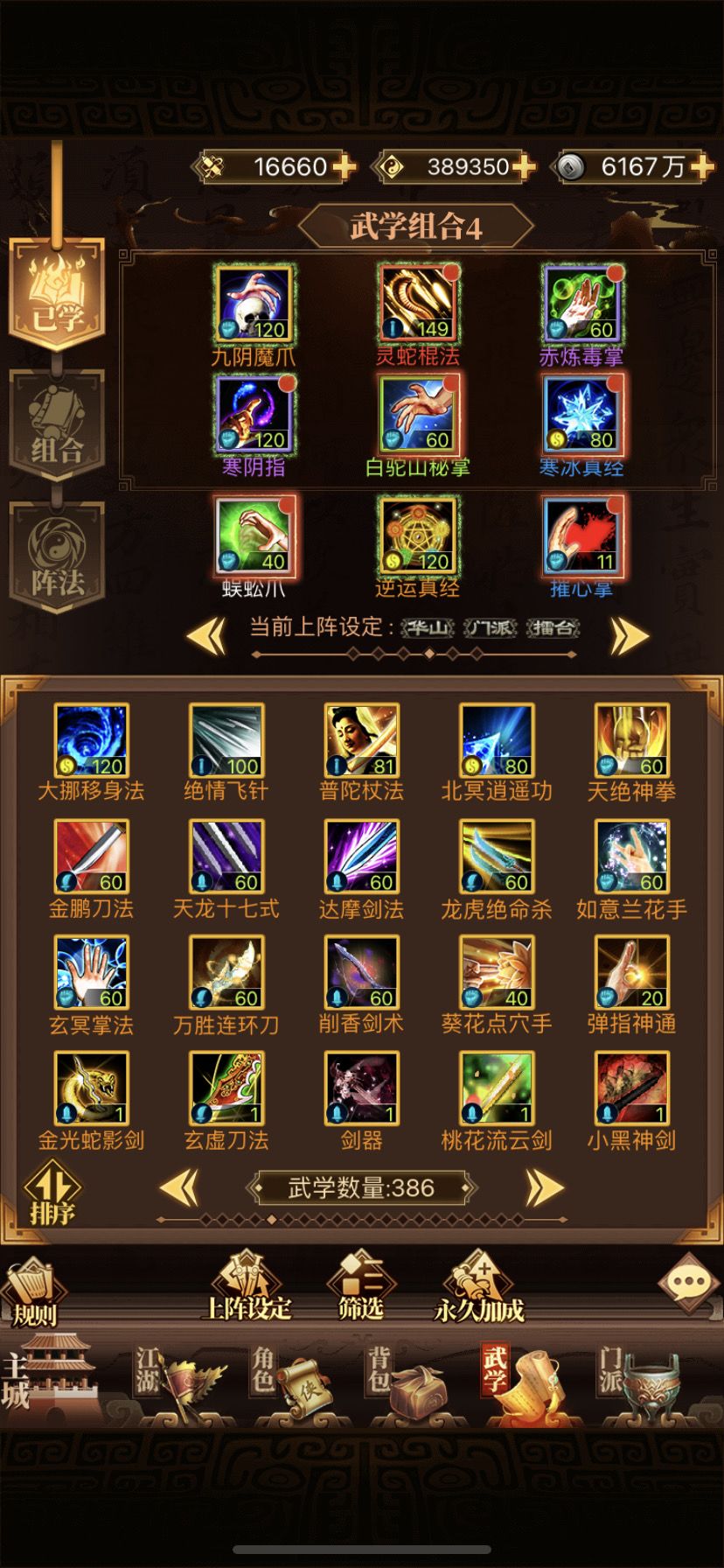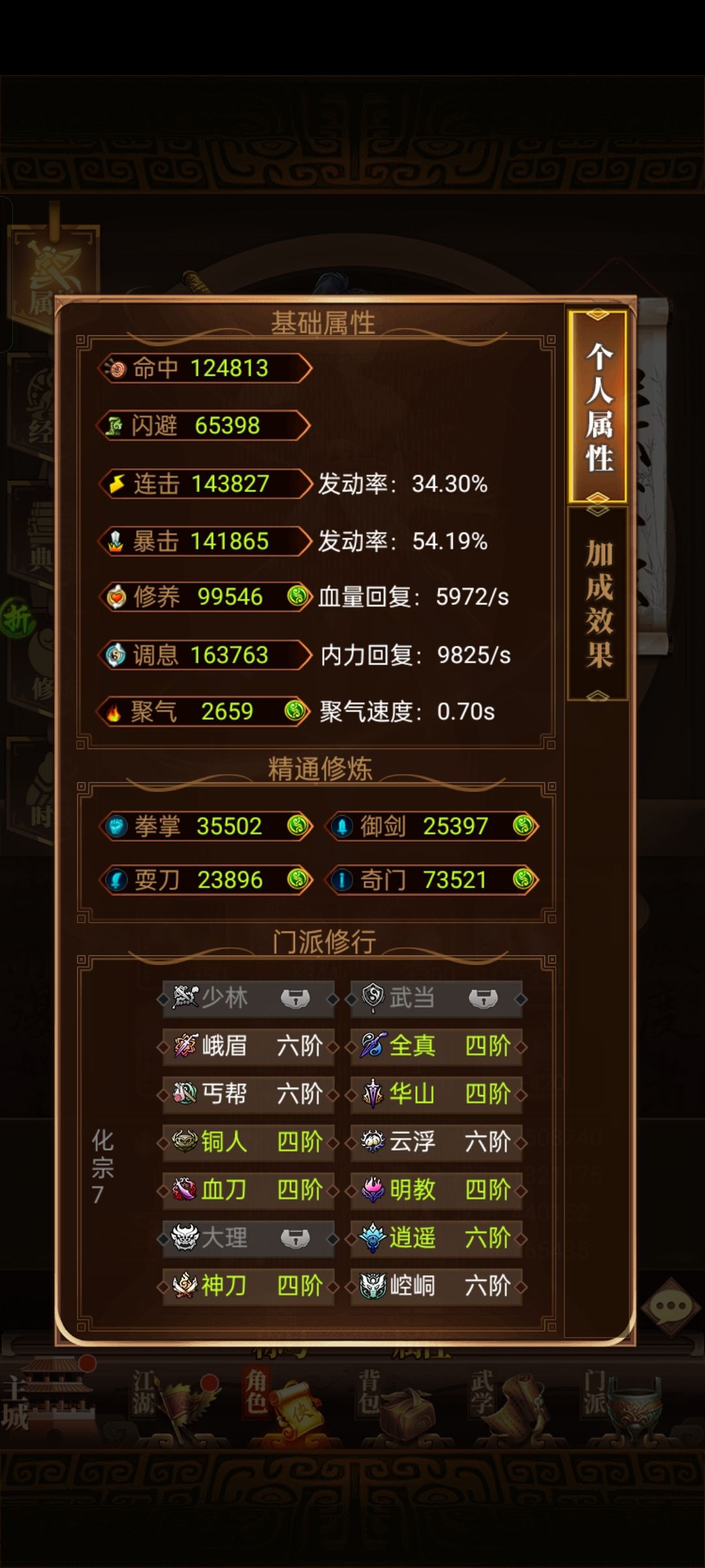 区服:武极化宗17服 玩家ID:滚刀天选骚年 角色ID:630646 一.门派介绍 这个游戏刀门自创大佬多,有许多优质自创,造就了当前刀门的强势,自然而然刀门氪金大佬也会比较多。以下大致介绍下四个门派。 1.血刀:门武高爆高伤,招式有致命和嗜血,后期突破150后,增加爆伤,非常强力,排第一毋庸置疑。 2.铜人:铜人门武个人感觉是能排门派武学第二的,刀客加流血还行,招式点满有35%触发率一口回血,然