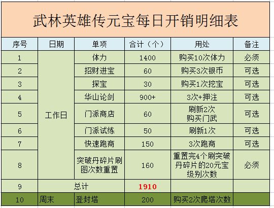 (更新时间:2022年6月28日) 前排提示:本篇将针对五个方面(①每日消费,②神功开箱,③刷图助阵,④经脉细节,⑤“逃课”爬塔)进行讲解。 角色镇楼 推图镇楼 一、每日消费 1. 每日消费表 2. 这个消费清单项目视个人每日收益增减,但我的建议是,留着的金子只是数字,只有转换为资源和战斗力的才是实质。 二、神功开箱 1.保底数量 ①神功碎片概率1%的,保底数量为3500,必出对应神功武学碎片3