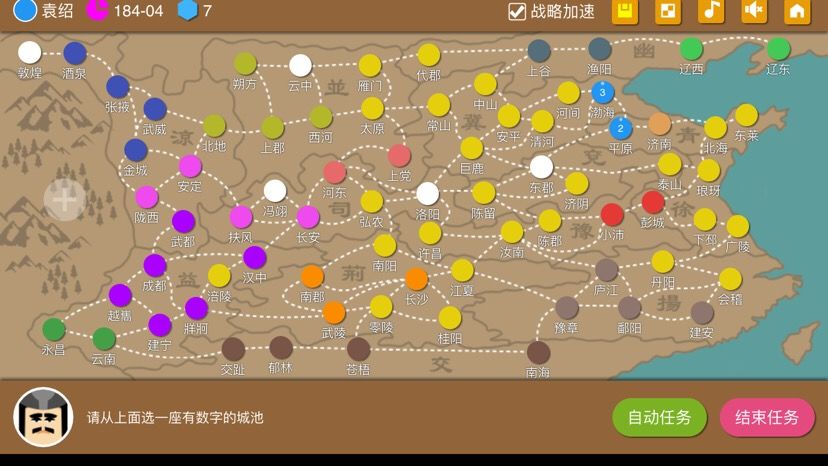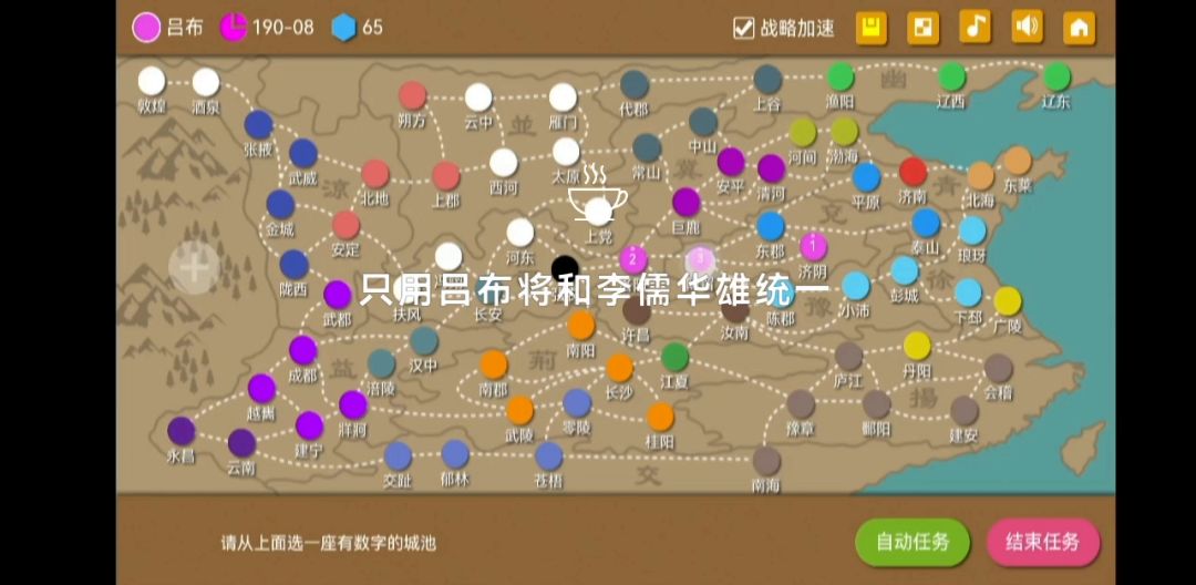 叛寿困难大图。 之前玩了一次随机叛寿困难大图,结果发现运气好没难度,而且城池的治安普遍都很高。没有挑战性,于是尝试了一把最难的版本。 君主选的曹操。 前期: 快速占领周边的空城,然后聚拢资源到东郡,卖粮食换钱买装备。 曹老板和两夏侯带上弓马直奔刘关张。 打残关张后杀掉刘备,然后就可以野外招募关张啦。 刘关张搞定后基本就开始扩张了。 关张组成一队,先收太史慈,然后南征东吴。 曹老板带二队先去占领关中,这时候由于董卓的无节操,手下纷纷叛变,装备齐整的曹老板马上去抢钱抢粮。顺便直接战阵笼络吕布,搞定华雄后组成三队。 曹老板由于装备齐整,直奔河北攻略袁绍,搞定颜良文丑后,顺带招募荀彧和郭嘉,阵容齐整直接北伐后平西。 颜良文丑加田丰沮授组成小战队征战辽东。 吕布华雄的三队招募贾诩,加上李儒,装备齐整后从洛阳南下克服荆州,再直接西进巴蜀。 关张一队平定东吴后配合吕布华雄挺近巴蜀。 曹老板二队平定西北后,也直接下到巴蜀。 最后三队人马在巴蜀胜利会师,天下太平! 后话: 统一天下的时候三队主力都才蓝色…… 曹老板开局太有优势了。 1、坐等董卓经常叛乱,叛乱的城池,每叛乱一个将领系统补偿1000资金1000粮草和10000人口。困难版本城池初始治安为300,300以下仁德低的武将会一直掉忠诚,忠诚掉到30以下很容易叛乱。困难开局的核心就是把因为经常战争导致治安低的城池,丢几个忠诚低的将领过去坐等叛乱。这些坐等收钱的将不要带兵!重复一遍,不要带兵!这样一旦叛乱,你随便叫个满兵的将领过去攻打,叛军就直接跑路下野了。随便叛乱几座城,粮草就够武装一支队伍了! 2、像卢植、吕蒙这种六边形战士,带个甲带匹马,驻守关键要冲十分好使! 3、侦查很重要!战场受降的弱智武将,什么都不用管,直接扔去周边的城池侦查,被砍了也无所谓。 4、佯攻抓俘虏!中后期由于敌方版图收缩,导致有些城将领很多,这个时候主力要直接打上去,只杀敌招降,不攻城,正常电脑的城池将领只有一两个的时候是不会进攻的,这样下个月咱们就可以按照既定计划稳步前进,不用担心敌军断我后路。 5、右上角,储存功能的旁边,点击以下可以查看每个城池的设施,分医馆、学院、集市和装备铺四种。如果某个势力的地盘城池没有装备铺,那这个势力就可以随便虐。清晰哪些城池可以买装备,占领这些核心战略设施,可以极大降低攻略难度。 6、忠诚度90以上的将领不会投降,但你可以把他的君主砍了,势力灭亡后直接下野。忠诚度40以下的可以笼络,直接战场起义。 7、如果想要快速统一,主力成型后,因为有经验等级,而且很多敌方的优秀将领没读书弱智,勉强拉进主力队伍未必有用。不用浪费时间,直接砍了。 8、SL大法很重要。武将读书,尽量SL到59,最后一次SL到65,这样从白板升两级加的智力,就很够用了。招募90+大拿的时候也可以SL,保证直接招募成功。SL的时候不小心删掉存档没关系,直接关游戏,重进后存档还在! 9、主力队伍一定要有两黄马配关刀的暴力输出和两黑马的暴力火攻,一定要带鼓,主力等级上去攻城掠地如砍瓜切菜。 10、全游戏最优秀的将领叫赵云!91年在常山刷新,谁用谁知道。能砍能打能控。每年1月份注意在野武将! 最后: 这游戏确实不错,不过挺费时间的。已删! 9、