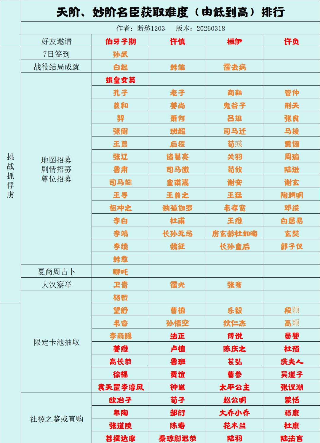 强烈提醒新手 一定一定不要跳过新手引导,接下来开始正题 特别特别提醒,到后期天级名臣所需要的经验非常非常高 天级本身就代表着一种数值巅峰 我在这里,再三警告新手,你的纹石到后面是绝对不够用的 因为你自己不仅要练主力阵容四位,你还要专门针对战役,再可能练上1到2位 我十分的提醒大家,开服一个月以后,蓝色基本上都是属于被淘汰的边缘,甚至是说完全没有用!!! 每个名臣一天刷的碎片只能是十个 人级 这位选