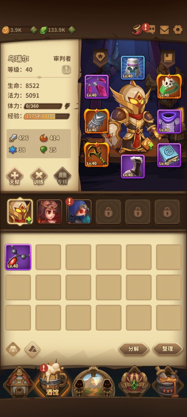2)竖版布局,羊皮卷的主背景、画面很干净,主要的装备图标、数值面板观感都不错;战斗界面,没有接触性的普攻动作,以不同攻击属性(普攻、暴击、毒、冰、火)的图标和伤害数值来呈现攻击过程,没有复杂绚丽的技能特效,一切都比较“平淡”,反而战斗反馈挺直接的;