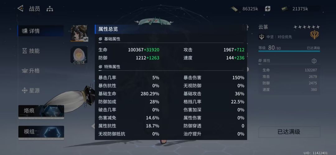 职业:特勤 速度:63 个人评价: PVP强度T1 PVE强度T0 技能优先升级推荐 技能1>源能爆发>普攻=技能2 PVP模组推荐4森罗侵浸+2怒涛之势 (注:也可以4怒涛之势2勇士or灵犀or霜寒or雳闪) IV(4)号位模组主词条推荐:速度 V(5)号位模组主词条推荐:攻击力 VI(6)号位模组主词条推荐:基础攻击 模组副词条推荐: 速度>基础攻击>基础生命=攻击 (注:模组可以追求
