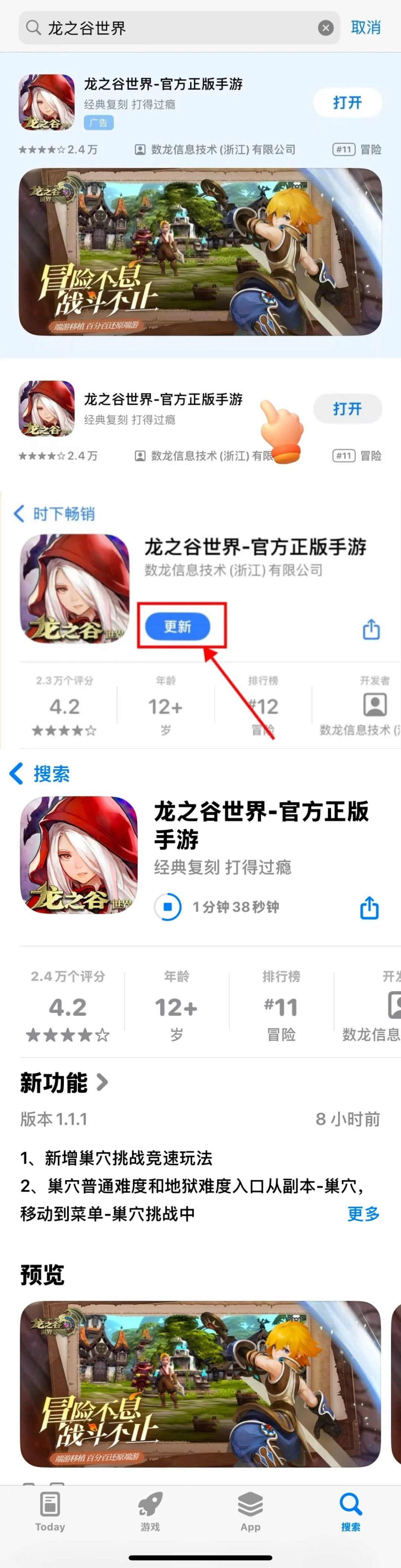 Q1:为什么我的iOS在游戏内更新后还是不能正常进入游戏呢?还会有闪退的情况呢? 使用iOS的冒险家们需要到App Store中对《龙之谷世界》进行大版本更新哦,更新后即可正常进入游戏。具体方法如下:在App Store中搜索《龙之谷世界》,不要点击打开,会自动进入游戏;请点击下图所示位置进入更新页面;点击更新按钮,会进入更新状态,一般来说冒险家们等待五分钟即可更新完毕,部分冒险家可能由于网络问题