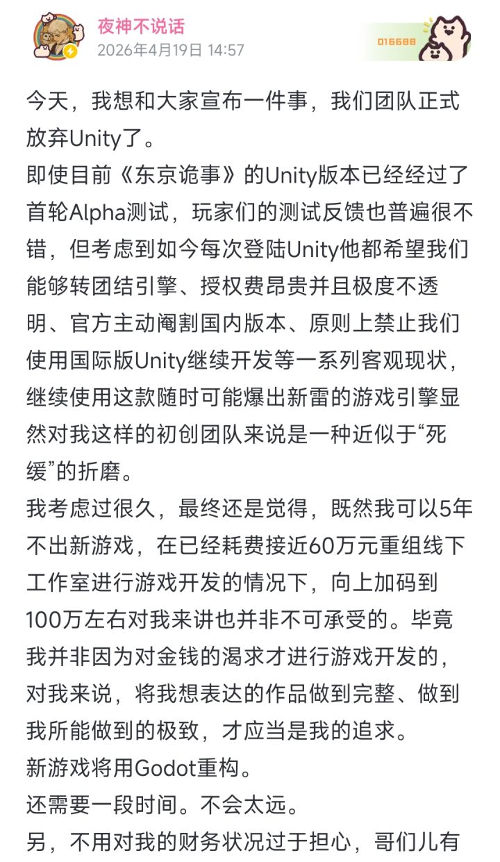 🛠️ 知名独立开发者宣布放弃Unity转用Godot引擎,或将累计消耗百万用于开发游戏 国产独立游戏圈近日迎来一则引发广泛讨论的消息,知名独立开发者夜神不说话正式宣布放弃Unity引擎,旗下新作《东京诡事》将使用开源引擎Godot进行重构。 他表示,尽管游戏的Unity版本已完成首轮测试且玩家反馈普遍不错,但考虑到Unity近期频出的对开发者而言的恶心行为,游戏未来将更换引擎继续开发 本作预