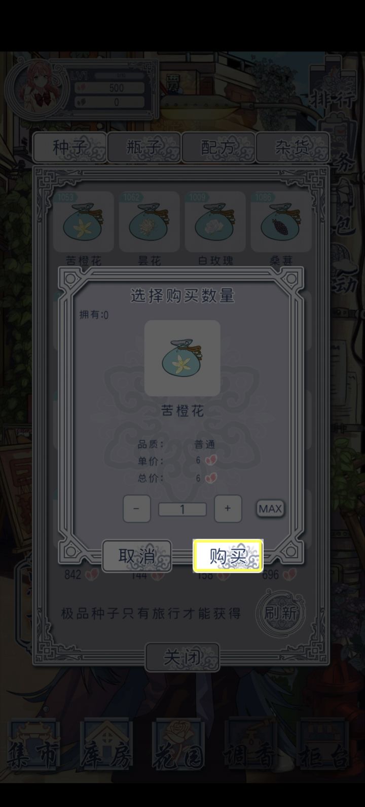 购买的花种价格是固定的,购买的瓶子价格波动幅度很大,比如原价750的瓶子最低可以去到500,最高可到1k,要想降低成本最好多刷刷商店。