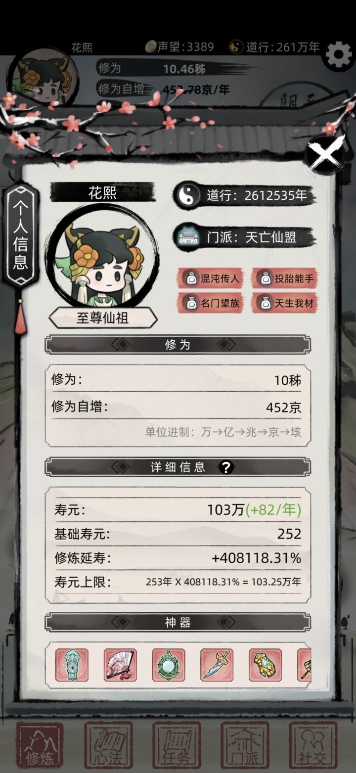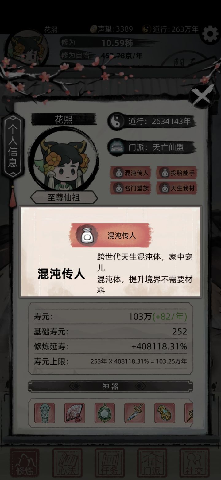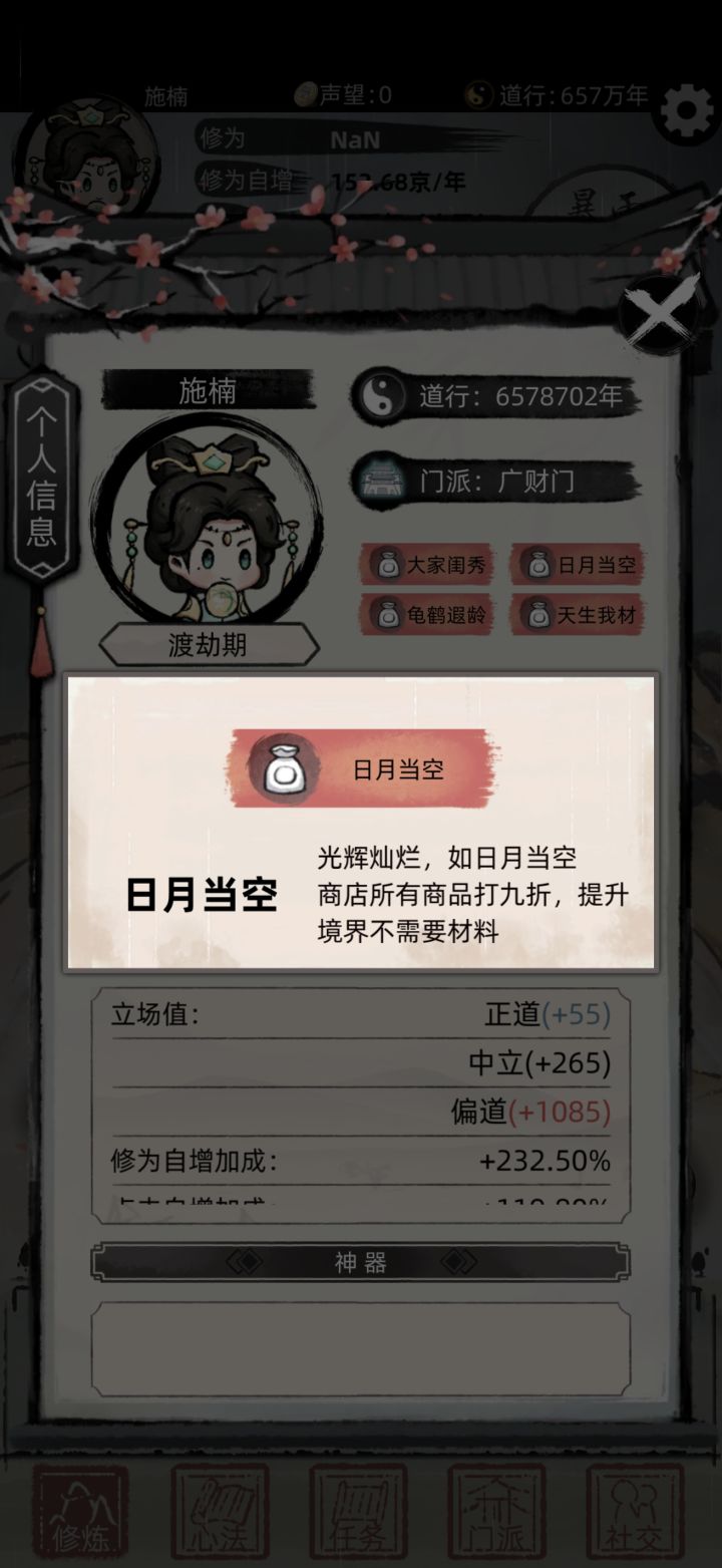 修仙世界 金钱开道!此攻略主要面向老手,各种小技巧让你熟悉游戏后更快修仙转世到九重天。先上毕业照1、开局到加入第一个宗门,推荐正道宗门,正道功法有金钱,寿元加成。2、正道功法篇:接奖励箱子的正道立场任务,领奖时包里不能有同样的箱子,保证你领取的箱子是包里第一个。后面只要包里箱子的一直最少保留有1个,不管你从任务 商店 宗门 得到的中立邪派箱子都只会开出正道功法。(如下图我接个奖励初级宝箱