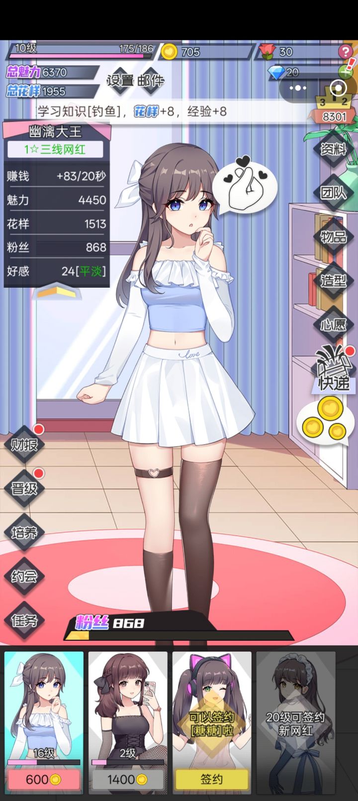 《网红女友》的所有内容就是类似七年前培养员工的放置休闲挂机,培养各种员工,为了增加二次元受众的包容程度,套上了“二次元女友养成”和恋爱的皮。核心还是古早的养成游戏,除了挂机就是看广告,已经彻底脱离当下的游戏市场。