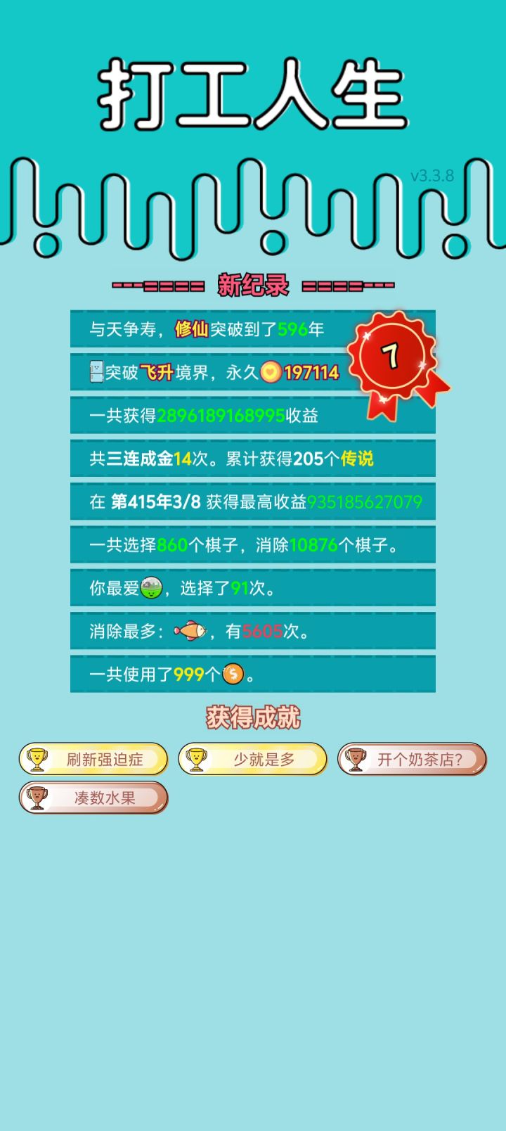 #单机游戏 #游戏推荐 我打工坚持了596年。获得了第7名。共获得2896189168995收益。累计获得205个传说棋子。共选择860个棋子,消除10876个棋子。我最爱道具盲盒,选择了91次。获得了4个成就!