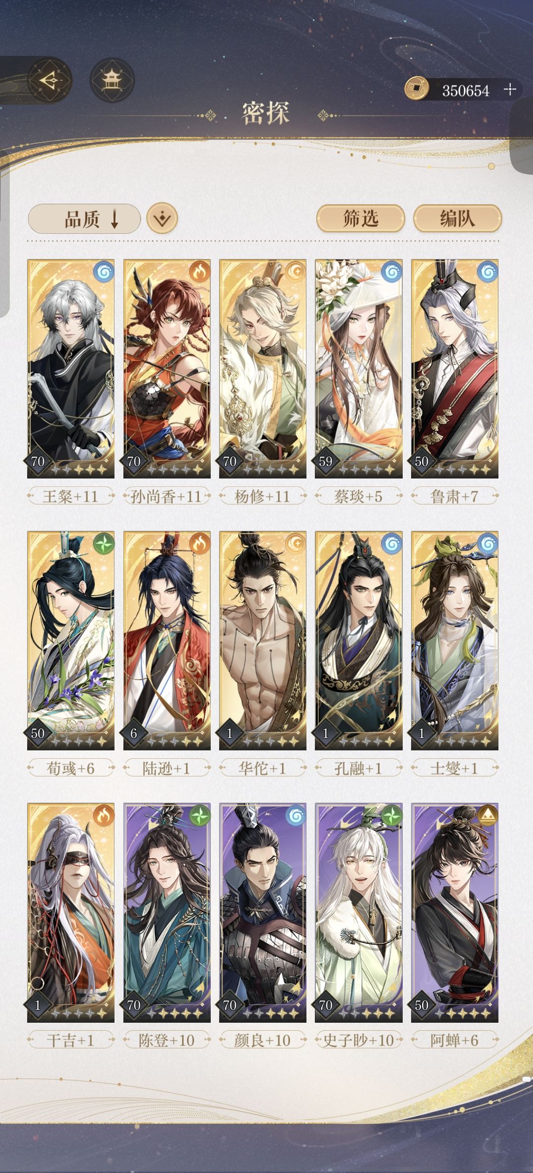 金色就王粲有用,就业期长,杨修看脸赌博输出,其他金色角色在外服很一般,贾诩要跟郭嘉一起搭配1+1>2奇效 紫色,颜良t,阿婵c,陈登增伤,史之眇奶妈必养,其他紫卡前期只能过度 运气中规中矩,无所谓了,慢慢来,不急 就业前景特别好 密探特训相当于每日每周任务 经济来源的巨头,每天都要完成,等级拉上去,解锁后面剧情玩法 对于没有主c的玩家而言,前期过度很合适,玉别乱用,等国庆限定卡池上线,孙尚香,孙权