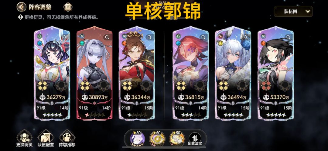 这阵容主打的就是高回能和控制对面,拖到后面持国的高输出,主养持国,主坦北方多闻天王,副c嫦娥,然后现阶段爆发队都有筋斗云,所以后面就不带沙悟净小白龙了,这两个启动太慢了 三大天王都是在红1后产生质变,整体队伍除了飞天都吃星级,特别持国嫦娥。黄狮精必须得红1,这样才能晕三个 主c持国(资源全往上面用,后期绝对的t0输出) 三个前排顺序是1.黄狮精2.飞天3.多闻(三个前排都巨肉)黄狮精一定1号位打控