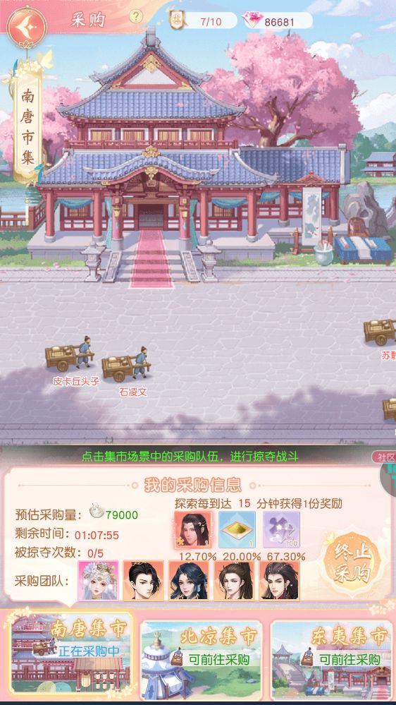 亲爱的掌柜,若想觅得世间珍奇之物,不妨遣派伙伴远赴各国市集,采购当地特产。此举既可获大量材料,亦可伺机对他人采购团队施以“掠夺”——但凡夺标成功,便可取其部分采办之利,充实自家囊中。 玩法入口: 点击游戏下方 "主城—采购" 开启时间: 开服第3天且角色等级23级开启 玩法消耗: “掠夺次数”、“铜钱” 掠夺次数每天0点重置到10次。 玩法获得: 潜能碎片、伙伴碎片、灵宠附灵石、碎玉等 玩法介绍