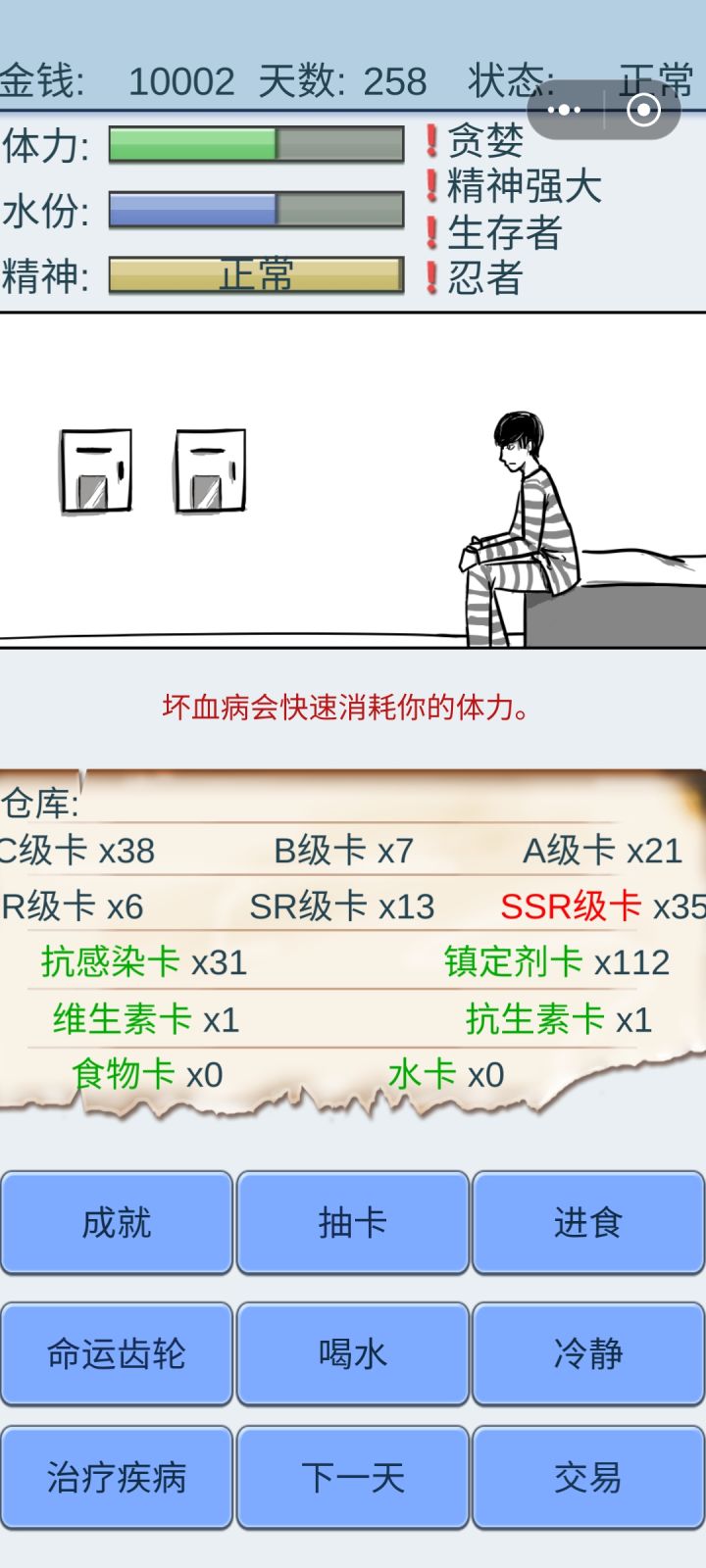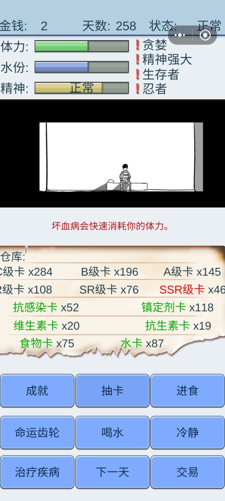 后来我又砸锅卖铁凑了一万,进行了一次1千抽,因为这个1万是分了两次才凑到的,就不贴图了。具体差不多是(括号内是按概率算张数):C卡224张,B卡204张(194,也就是概率19.4,上面一个回帖写了发出去之前被误删了),A卡130张(130,很巧),R卡106张(96),SR卡45张(64),SSR卡20张。食物79,水80(78)抗感染17,维生素23,抗生素13(20)——总体来看,这次实际概率波动更大因为SSR多了近一倍,导致镇定剂卡留存量变成多了24张(精神缺了两张的量来算就相当于多出来22张),但根据上面推算,实际就抽到40张。主要是用的少了好多只用了16(18)张(浪费的更多),相比上次11张ssr卡用了40,这次20张ssr用了18,大致估算一张ssr相当于加了2接近3张镇定剂效果了。