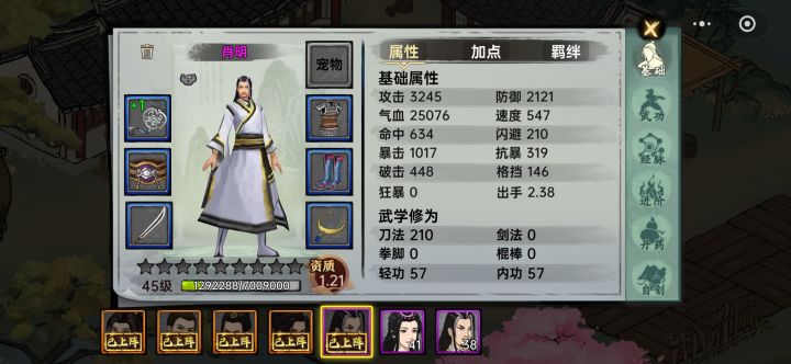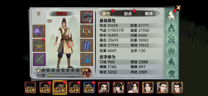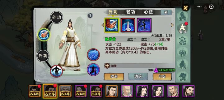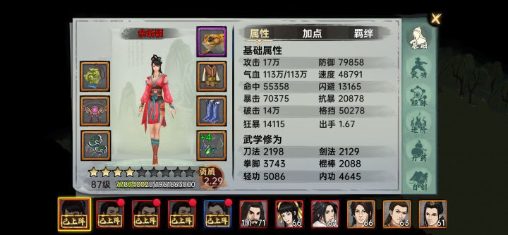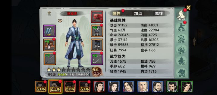 感觉不对,这游戏没有扫荡功能,推副本很麻烦,因为学武功就能加攻击,感觉前期高品质武学数量不足的情况下,应该把高品质的红黄武学和资历集中给一个主力红将,配合高级群伤技能保证他出手就能秒怪。