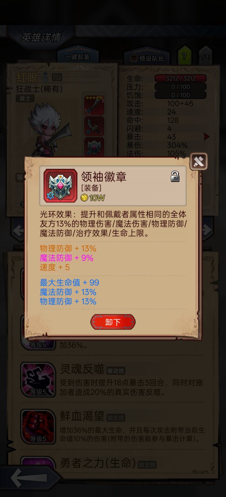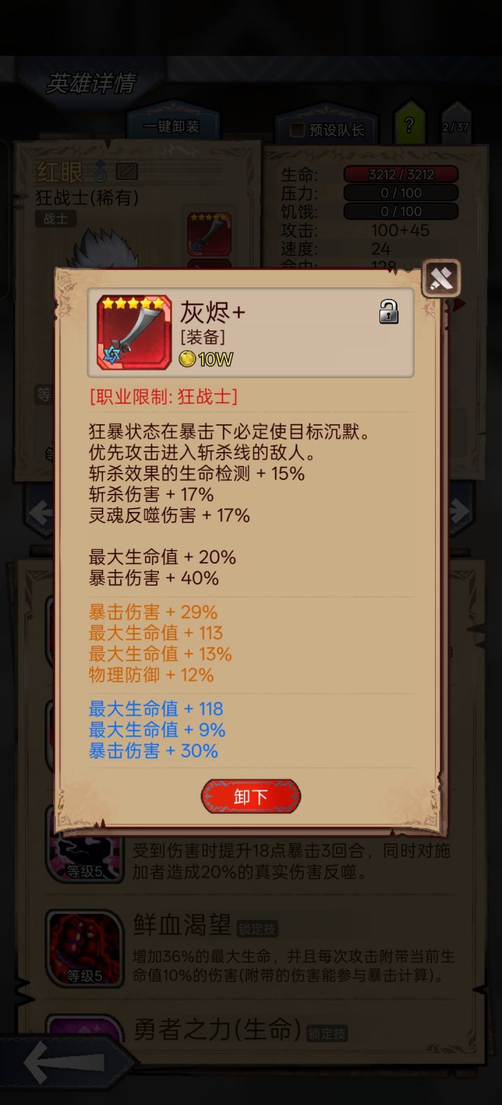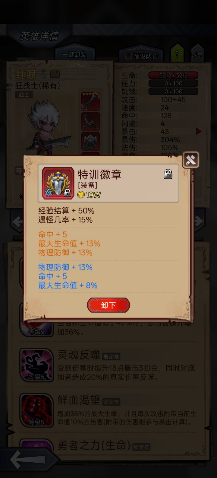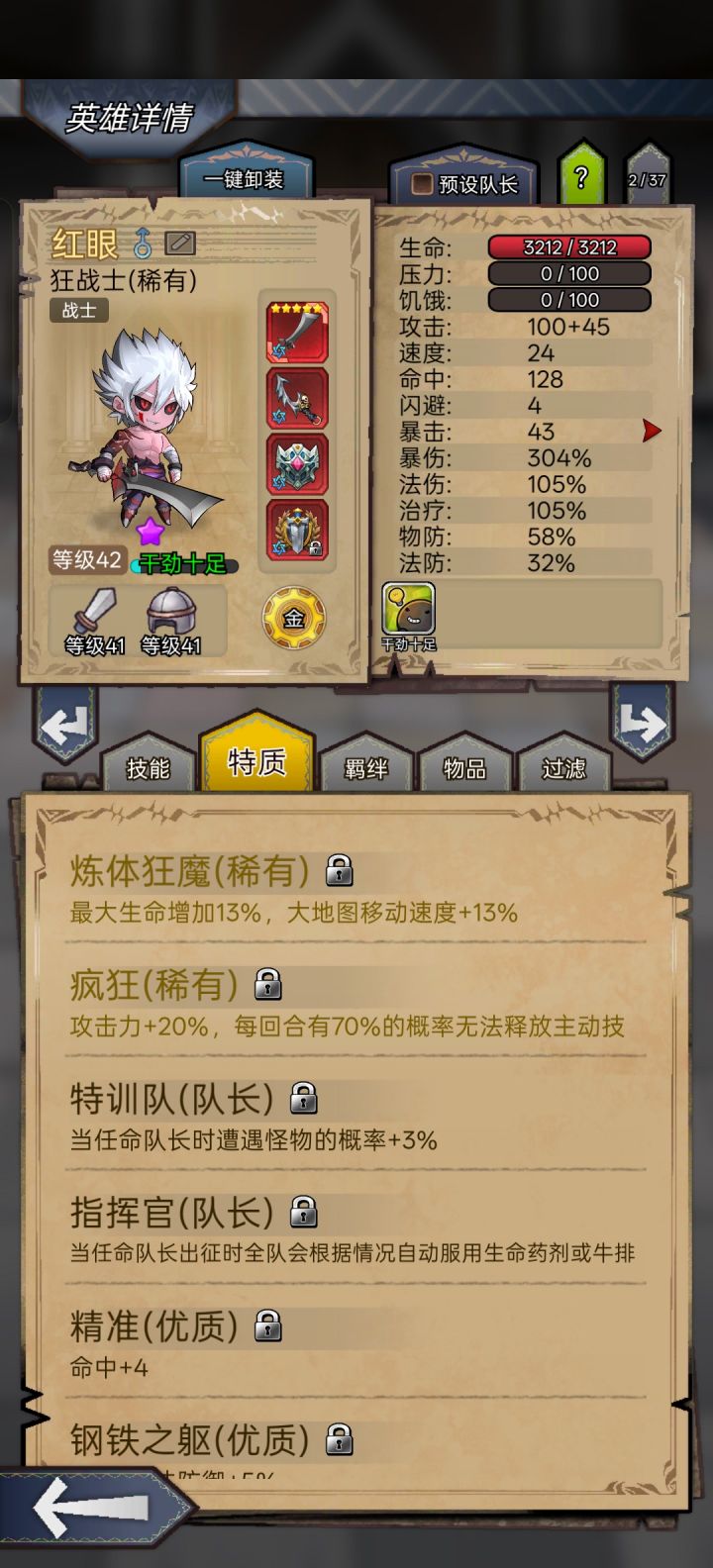 #狂战终于能单刷了 应该算比较低配了,参考了各位大佬的攻略,血量3200,羁绊1紫1蓝1绿就行,没有红色精华,关键是参考大佬的用了领袖徽章,还有就是特质选指挥官(自己吃药那个),进图带红药和净化药剂,刷了一天没有翻车。