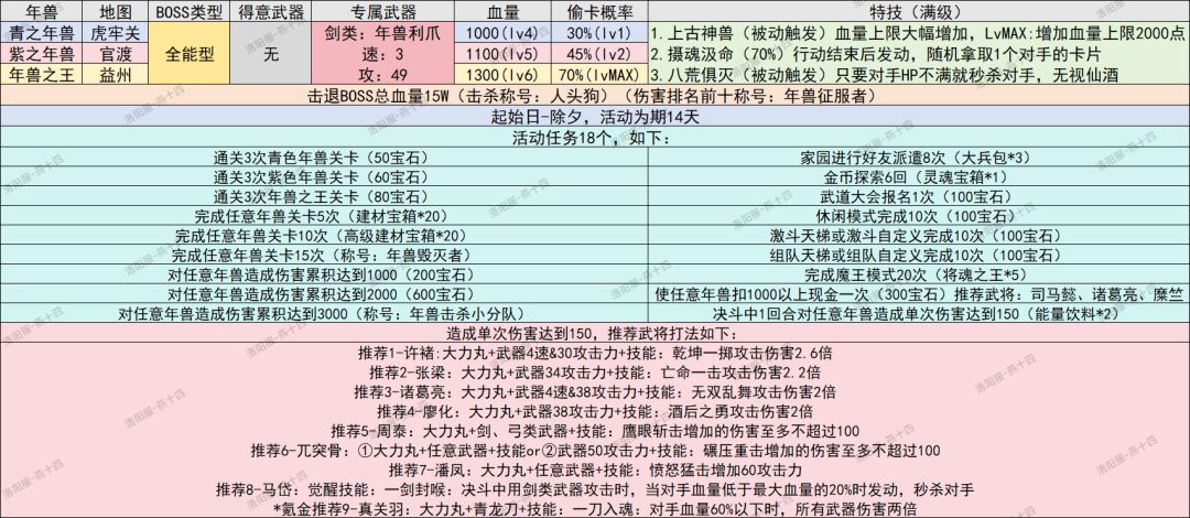 我个人意义上认为的养成分升级(包含觉醒、突破),服装,技巧至少是这三方面的提升。再加个专武吧 对于升级,需要用角色魂或者四种势力魂和万能魂。这里要说两种不同目的的玩家,强度党和收集党(能长期玩下去的)。有些角色可以通过方法获得其角色魂,而有的角色升级完全靠势力魂。包括但不限于: 扫荡魔王——貂蝉,吕布,孙策,真刘备,黑白诸葛,张宝,等。外加张昭也是新手角色但暂时获得途径少。 真陆逊——攻城战