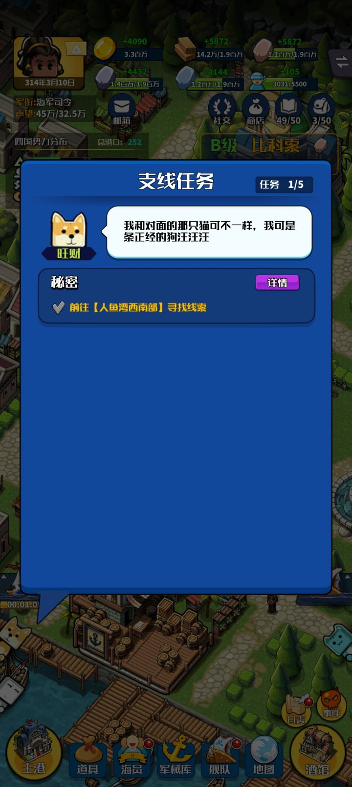 目前打到这里,正在跑商升级船,氪金建议氪个荷兰人,四炮室一甲板炮能让船长的伤害最大化目前表妹是最强的船长,电球非常强,肉搏船还没玩过另说表妹当船长打海怪非常好用,前期在推到冰国的时候有轻型长炮就够了,照着主线支线走就行,基本都打得过任务,没钱就跑商,就是有时候会打不过海盗,等声望够了跑商攒够三百多万,去赤海主海神国之都造ss级重型长炮和几个s级甲,海怪牙齿任务会给这是以前的图除了八爪鱼