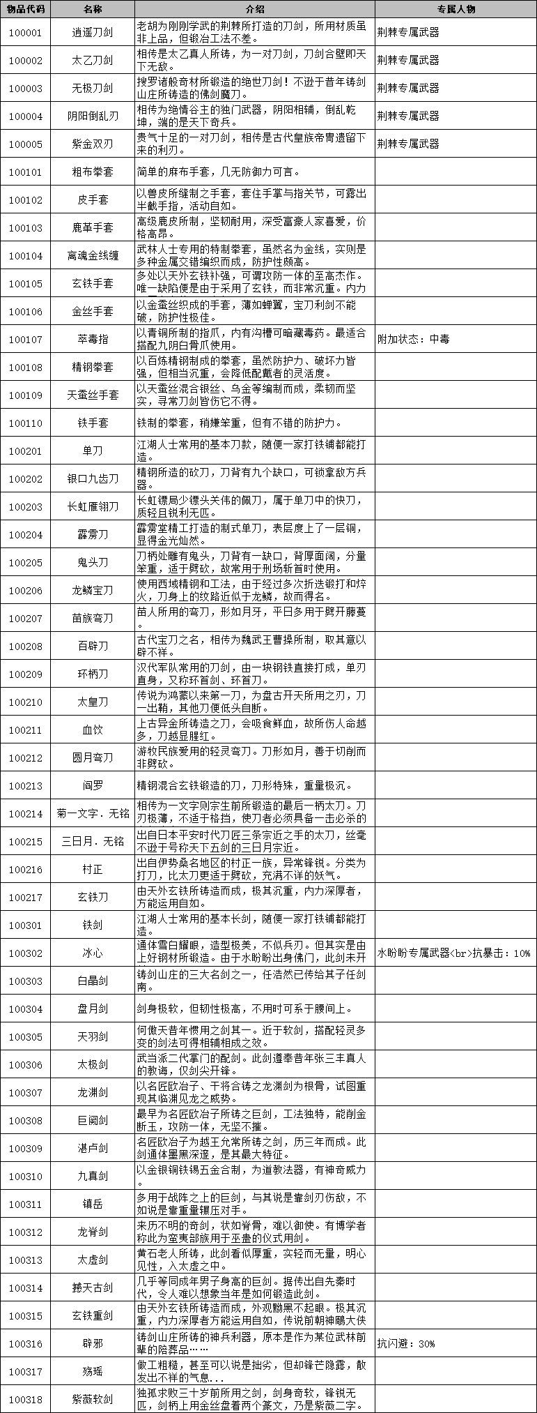结合mt等管理工具可实现更改物品,数量等,下面是物品代码: 100001逍遥刀剑 100002太乙刀剑 100003无极刀剑 100004阴阳倒乱刃 100005紫金双刃 100101粗布拳套 100102皮手套 100103鹿革手套 100104离魂金线缠 100105玄铁手套 100106金丝手套 100107萃毒指 100108精钢拳套 100109天蚕丝手套 100110铁手套 10020