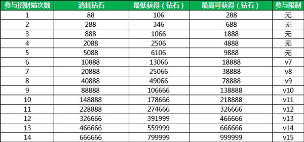 自从2.8.5版更新,将招财猫的抽取次数上限从原来的最高9次,增加至14次之后,很多小主开始关心每个档次所需要的钻石以及要求。 下面就为各位小主,做一次最新版本的招财猫介绍。 一:开启条件 角色等级达到32级 二:功能介绍 招财猫一共14次抽取,其中前5次抽取为无限制,第6次要求VIP7,第7次要求VIP8,依次递增至第14次(需达到VIP15),每次抽取所需的钻石不同,最高获得的钻石数量也不
