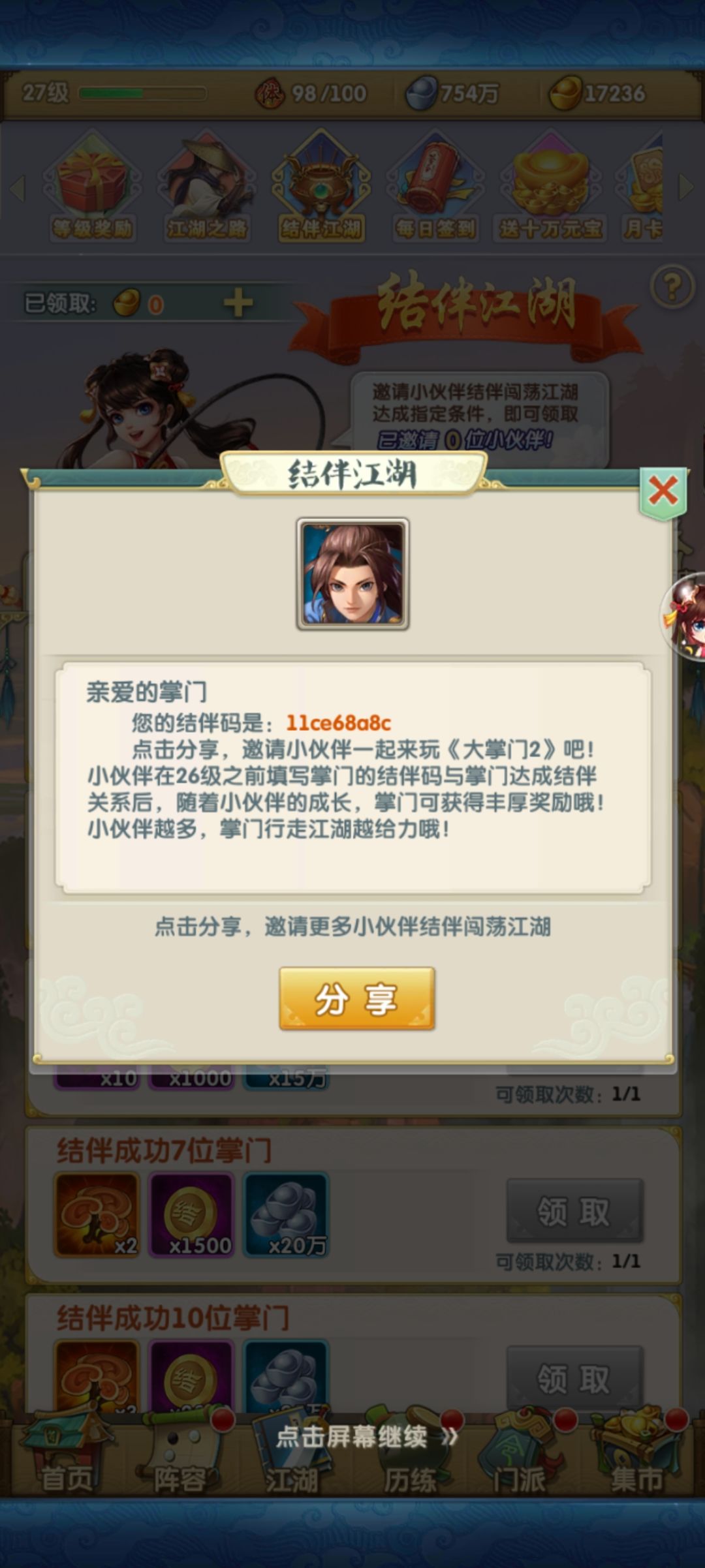 一款好游戏怎么能没点攻略呢-_- 为你新游开荒上道儿添砖加瓦! 有请结伴码: 11c4cbce1送元宝!送元宝!送元宝! 填写位置:游戏主页左上日常活动最后  那么现在进入游戏吧。我是小李开局的,所以会以小李的角度去写,以下有关阵容部分的列举都以小李组的角度出发,其他开局可以类推。其他还有十一郎和西门的玩法,选择自己喜欢的就好。 小李玩家阵容建议:小李,阿飞,沈浪,白飞飞,叶开(叶开可以替