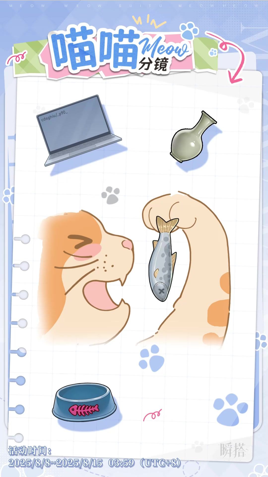 ⏰活动时间: 8月8日更新后—8月15日03:59(UTC+8) “喵呜,喵喵 喵喵喵喵 喵喵喵!” SU市的猫猫都在喵喵咪咪地说什么呢,难道是要给搭子们...?! 活动期间,完成指定活动任务,解锁获得猫咪节限定4星摆件: 【宁静的摆设】、【花瓶事故】、【请加点鱼】、【猫的战利品】、【喵行路线】、【输出乱码】! 解锁每日全部摆件之后,还可破译猫猫的语言哦~ 快来看看它们在对你说什么吧🐱 *具体活动
