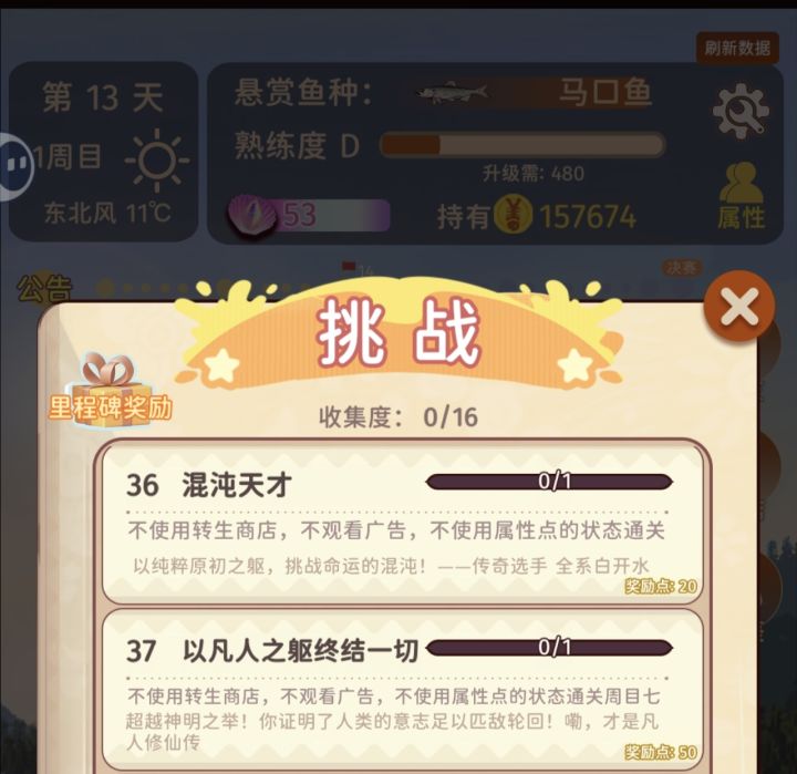 好难啊,试过金色优雅战斗什么都能钓采集,或者其他搭配,两个优雅战斗,两个什么都能钓,两个采集,还有开饵打窝鱼市,一周目45万都到不了。限制太多了,不带开饵只能钓6把一天,不刷广告一般只能带三个天赋,商店也买不到多个打卡,折扣,道具不多鱼也卖不上价没多少星和鱼币。我在想只能以后不删档,专门带刷好感天赋把几个角色解锁近乎满级享受永久加成,然后在想想怎么搭配