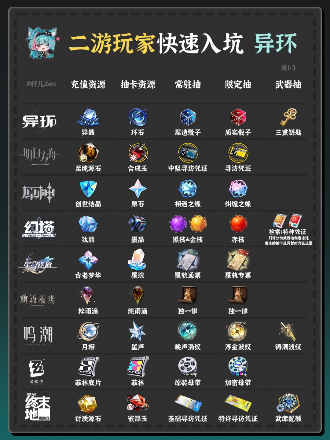 异环与其它二游道具对比图,便于想入坑异环的异能者快速上手 ———•✦•——— 图文攻略指南 ⭐ 本图文仅为了方便喜欢二游的玩家轻松入坑异环,去体验这款都市二次元开放世界游戏,无其它对比等目的,大家理性使用 ⭐ 除异环外,其余二游按照公测时间顺序自上而下排序,排序位置无主观因素 ⭐ 这些游戏都是很优秀的二游,如果想入坑哪款本图文也可起到相应的作用 ⭐ 部分道具可能非完全相等,仅类比,如有相关信息欢迎