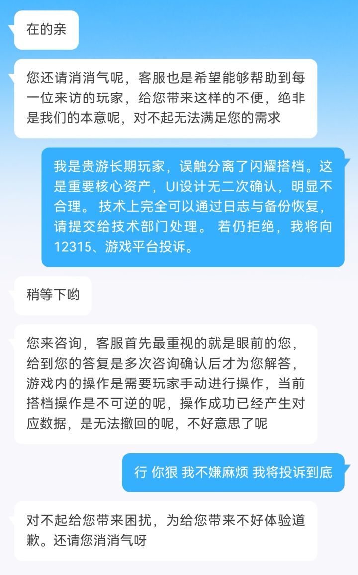 我是《无限梦境》长期玩家,因UI设计严重缺陷,误触分离了自己倾注大量心血的闪耀搭档,一键永久分离,无二次确认、无冷却、无反悔机会。事发第一时间联系客服申请数据恢复,提交UID、时间、操作记录,请求技术部门调取日志与备份回档,得到的只有冰冷的“无法处理”“不予理睬”。 我想请问官方: 1. 技术上真的做不到吗? 服务器有完整操作日志与定时备份,恢复单个账号核心数据,对技术团队不过是几分钟的
