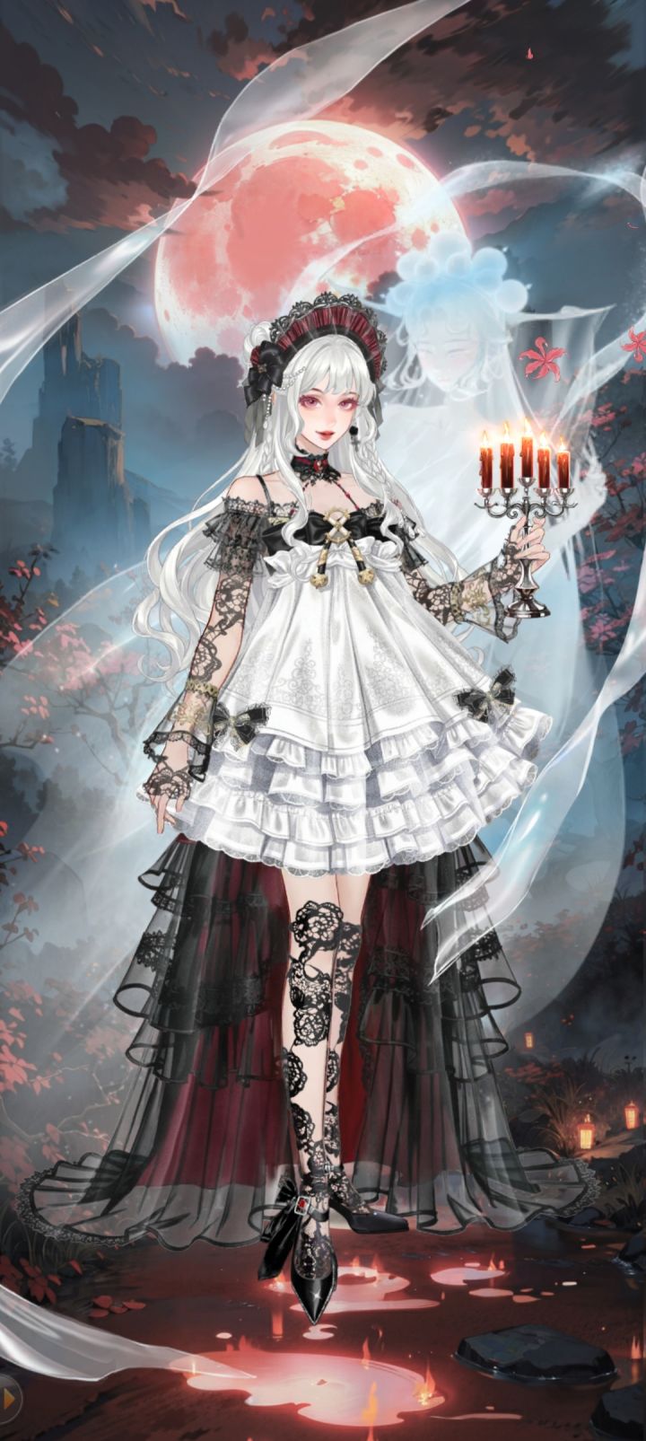 血月缓缓升起,照亮古堡的轮廓,她从绯红的丝绒深处苏醒,唇边那一抹殷红是夜的印记。烛火摇曳,倒映着玫瑰色的涟漪,此刻万籁俱寂,唯余心跳的回响。▮活动限定·5星时装复刻 -血月魅影绯月当空,永夜的贵族向你发出邀约~5星时装「血月魅影」将于无限盲盒活动中限时复刻!✧套装集齐加成:『抗连击』属性✧套装获取途径:『无限盲盒』活动银白色的双马尾好像软软的棉花糖~红宝石般的眼睛在夜色里闪闪