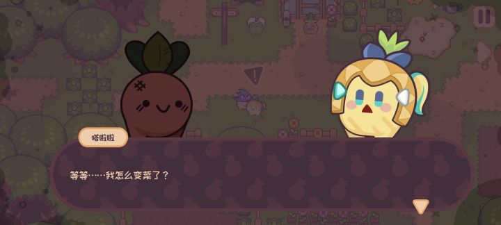 游戏画面采用像素风场景加上Q版可爱的立绘,开头呆萌可爱额头上还有个井字棋印记的大头菜就是玩家所控制的角色了,因为角色都是各种水果蔬菜,所以“家”也就是温室或农地