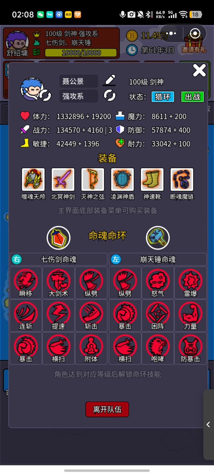 #斗神大陆2 综 合 战 绩:1291分首 次 过 关:奖励20000金币 人数挑战:-2000分 剩余能量:1895分 关卡回合:1416分 命魂相克:-20分闯关阵容(7人 42回合):1、子车双平 100级 强攻系 黑纹虎单命魂2、祝韵婕 100级 辅佐系 翎羽扇、寒冰蚕双命魂3、计缜伦 100级 强攻系 霸王枪、鸡腿双命魂4、钟离茗 100级 控制系 吞天蟒、荧惑兔双
