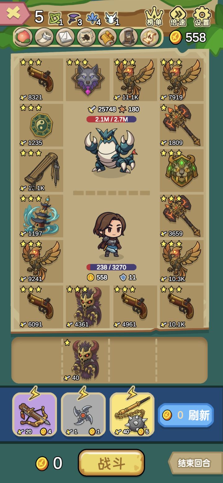 肉鸽自走棋玩法。还没新手教程,一上手很茫然,摸索会儿懂了,就停不下来。点战斗随机装备,触发效果,没金币就结束回合,轮到怪物攻击,后续就是金币购买装备,进行构筑。死了两次才知道,相同装备还可以拖到一起合并,并提高星级,同时可空出格子。建议赶紧出新手教程,要不很多操作都不知道。