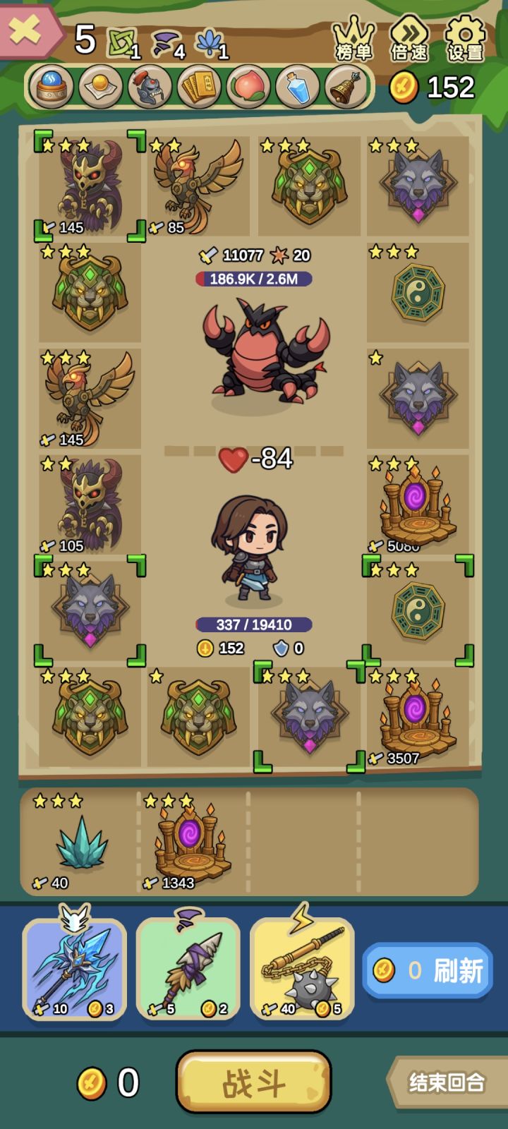 局内周边的格子通过回合解锁,下方是商店功能,可以购买商店中的物品摆放到格子中去。商店刷新物品随机,有几个备用格子,可以作为倒腾更换的空间。同星级的道具可以二合一升星,规则与很多轻度游戏相同,也像自走棋部分设定。
