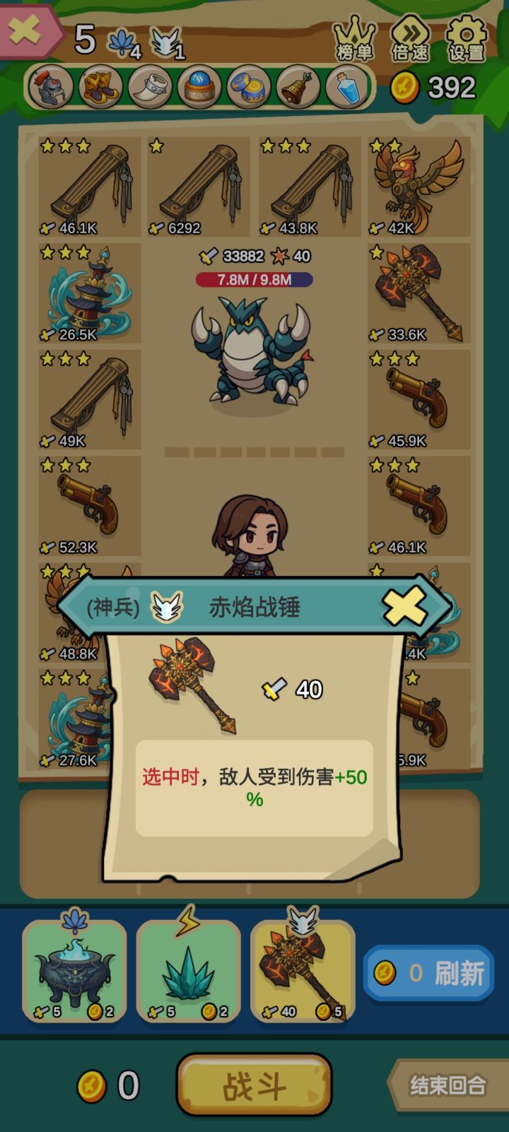 做工品质不高,三星友情鼓励。玩法是轻度游戏设定,内容很单一,战斗是回合制的,点击战斗开始随机抽选格子,若抽到武器可以对怪物进行攻击,抽到资源可以选择再抽,没有金币进入下一回合,直至消灭怪物晋级或被怪物干掉。