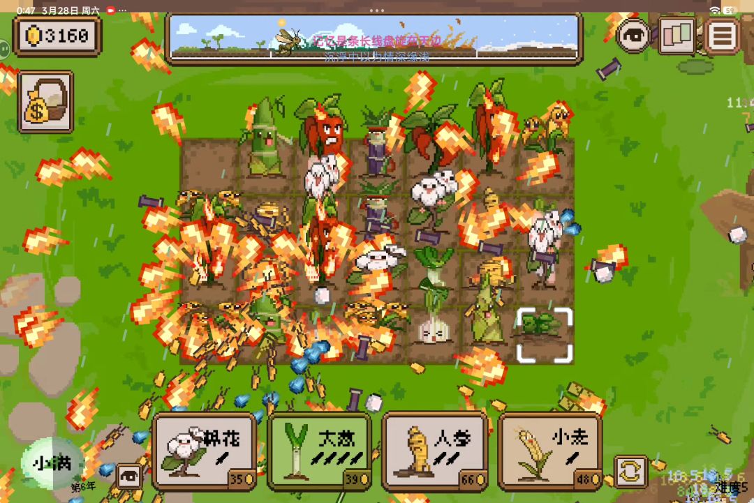 考虑了下棉花可能还得削,你这八个棉花加触发三次,一个人参就能让周围作物伤害+300%,这很恐怖了,玉米小麦流手转断了可能都没有这么膨胀的数值,另外为了让经济流能玩我打算再加一个新作物红薯,这个作物是消耗金币获得增益的,算是填补了钱太多的空缺