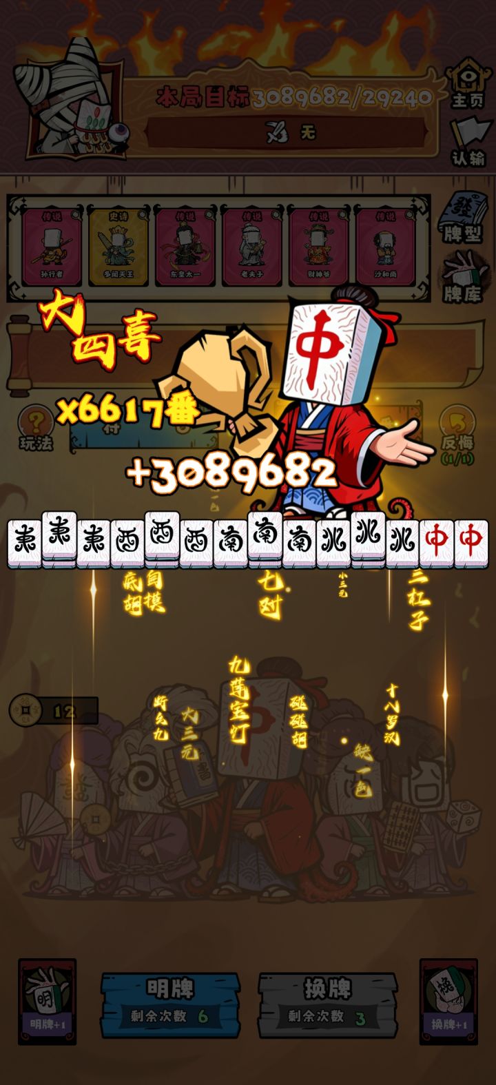 好耶!中奖了,然后推荐玩大四喜加十八罗汉最贵一把3000万分还是没全升满人偶的状态