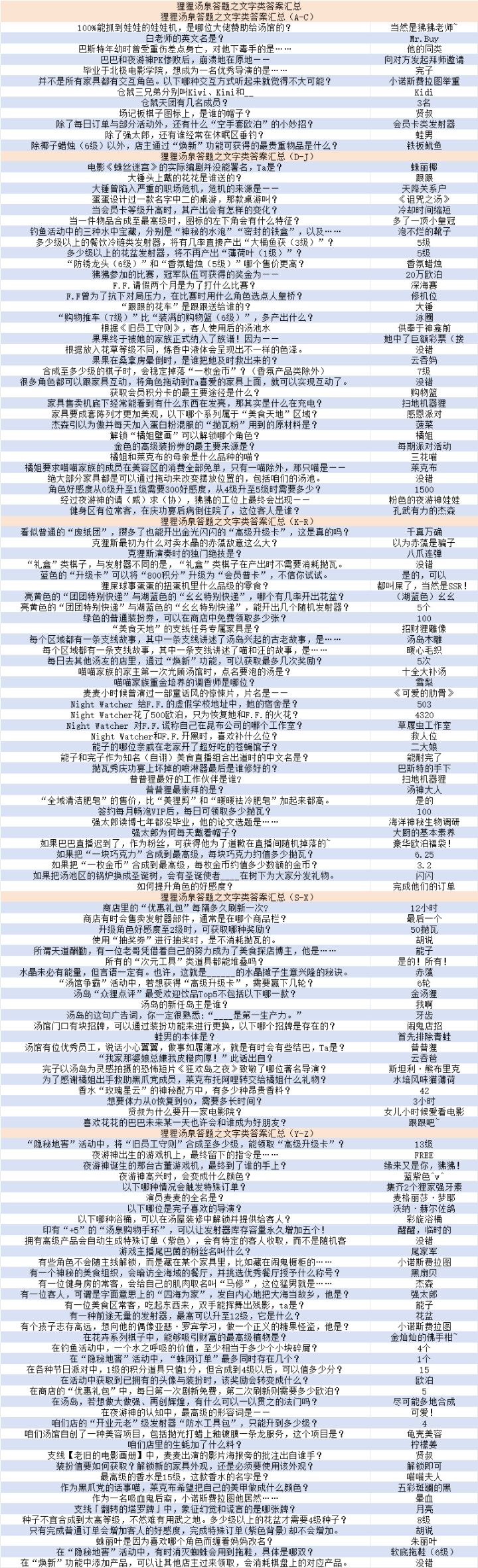 感谢各位汤友的热心分享つ♡⊂为了方便大家对照题目,我把能搜集到的内容都整理了一下♡(*´∀`*)人(*´∀`*)♡ 📋 表格使用说明: 题目按【首字首字母】A—Z排序,大家可以快速查找对应问题。P6是总表格。 如果有遗漏或错误,欢迎大家指正补充˙ᗜ˙ 2026.2.25一编,修正答案为【他的同类】【二大娘】,增加了12道新题目。2026.2.26二编,增加4道新题目。2026.3