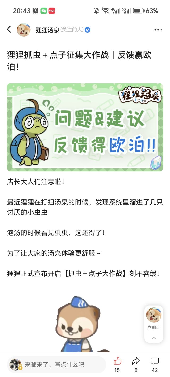 我是小红书从年前就开始关注你们,等你们出app版本的,一直在刷你们的帖子,今天进来玩了测试了,整体来说游戏还可以,但是广告太恶心了,一直反复在我手机上面下载红果之类的app.,我能接受看广告,但是不要这种不下载就不算看成功的广告好吗?二更:我再来补充下,游戏还是挺有意思的,就是广告会下载软件是败笔,求求了狸狸,哪怕你搞59秒的广告都比下载软件好,改改好吗三更:然后今天发现,切换到广告页面,再切