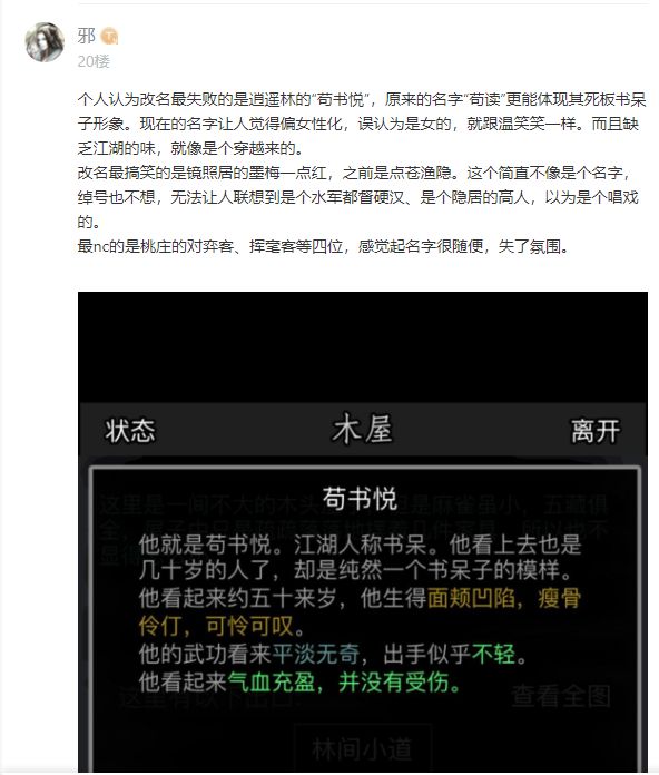 经过我们对所有参与活动的回复,进行了猜测准确性,猜测理由的有条理,脑洞等多方要素进行考量进行评选。首先感谢所有参与活动的少侠愿意将自己的想法与大家分享,同时感慨各位少侠的脑洞确实很棒😄😄😄。一、一等奖奖励内容:书籍:《杯酒江湖》一本(放置江湖背景剧情补充,和许多大佬的同人文的集合)获奖名单:二、二等奖奖励内容:江湖怪谈礼(内含论坛专属装备)*1奖励名单:三、三等奖奖励内容:金属