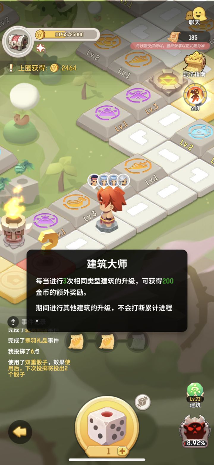 个人感觉水果这个可以买场地,如路过葡萄场地,购买场地,第二圈路过这会加金币,可以升级场地,这样会更有趣一点,骰子🎲也会不够,耐玩一点,这次水果这个目前第一关没难度,第二关打怪兽,可以不选择打,打失败了啥也不扣,继续出去加攻击力,可以换成每个地方加 攻击,生命,暴击等各种属性,有连击,眩晕闪避等,这样简单易懂,可以走各种流派