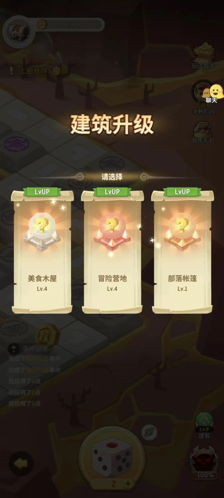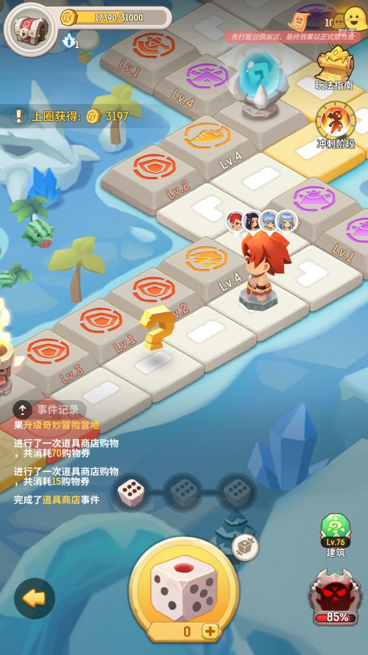 第一关是卖水果,卖到3000金币会进去下一关,第一关需要注意的就是尽量到终点金币够,别2900左右不够还要跑一圈,建议30%50%随意,越高越好一个水果是10金币,20%就是能卖12个,30就是13个金币!3000金币就能通关了,加油吧,第三关也是这个,第二关就是打怪兽,每次都会加攻击力,看情况选择建筑升级,打boss也会给金币,攻略发的人很多,建议都看看,毕竟几分钟会大彻大悟,这个骰子就是