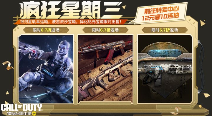 把这周的宝箱和卡池返场都端上来看看~4月1日(本周三),本次疯狂星期三返场的三个高人气宝箱分别是银河星轨宝箱、液态流沙宝箱和异化纪元宝箱。疯狂星期三活动期间,战士们将享受6.7折的超值福利优惠。本次返场的三个宝箱各拥有一次特惠十连抽体验,战士们前往“特卖中心”,花费12软妹币即可十连抽一次!此外,瘦普还准备了超值半价购活动,使命卡片x200、幸运币x200、专属补给卡x200,三种礼包通通半
