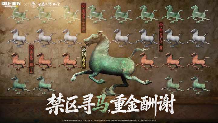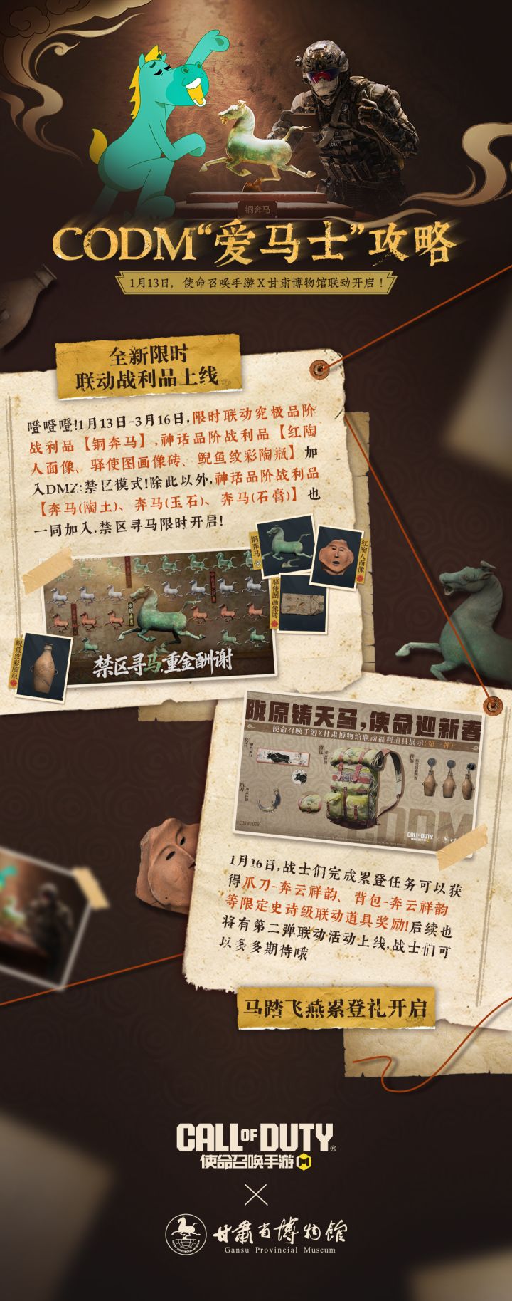 1月13日 使命召唤手游 X 甘肃博物馆联动正式开启! 全新限时战利品(真的有好多匹马) 将于DMZ: 禁区模式中刷新~ 1月16日起,限时联动活动也将陆续开启 完成任务即可领取限定联动道具哦!