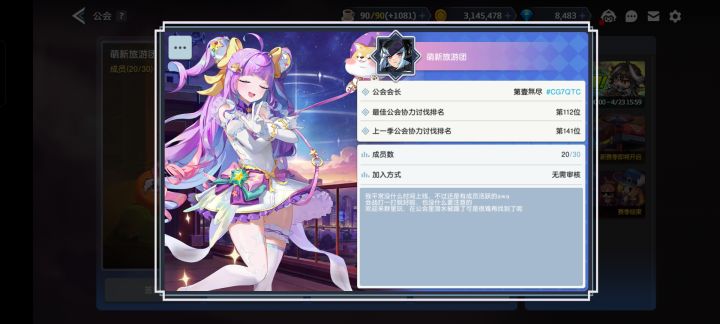 公会名燐燐开花,q群是527622896,本期公会战排名111,这期空余位置有2个,快来吧快来吧要求的话,上期会战总计伤害9e以上,或者每天会战伤害平均算下来差不多即可,合适的话就来看看来看吧