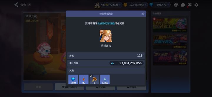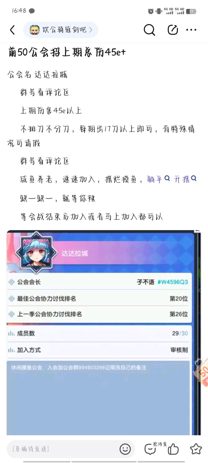 公会名燐燐开花,q群是527622896,本期公会战排名115,这期空余位置有2个,快来吧快来吧要求的话,上期会战总计伤害9e以上,或者每天会战伤害平均算下来差不多即可,合适的话就来看看来看看吧