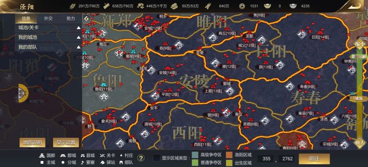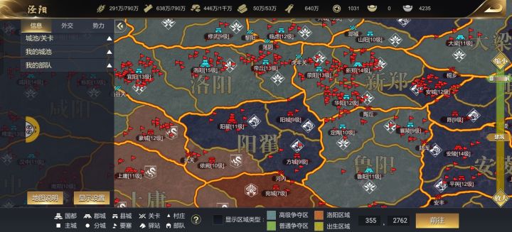 自2级关卡开关以来,01区的战况,可谓愈发猛烈。从地图上的旗子应该也能看得出来,基本上每天会出10波以上棋子。 先是先是双方在艾,无阳对战数天,后又在松阳对战,就在昨天,吉祥又迅猛将战线推到洛阳虎牢关,并将国都迁移到新郑开国都保护,从而搞要塞,巩固阵地(进攻方开国都搞阵地,这一点我有点不太理解),并且将分成全部搬进新政,这导致其大后方庞已经没有兵力把守,从而使从未攻入庞的九尊直接轻松攻进去。 就