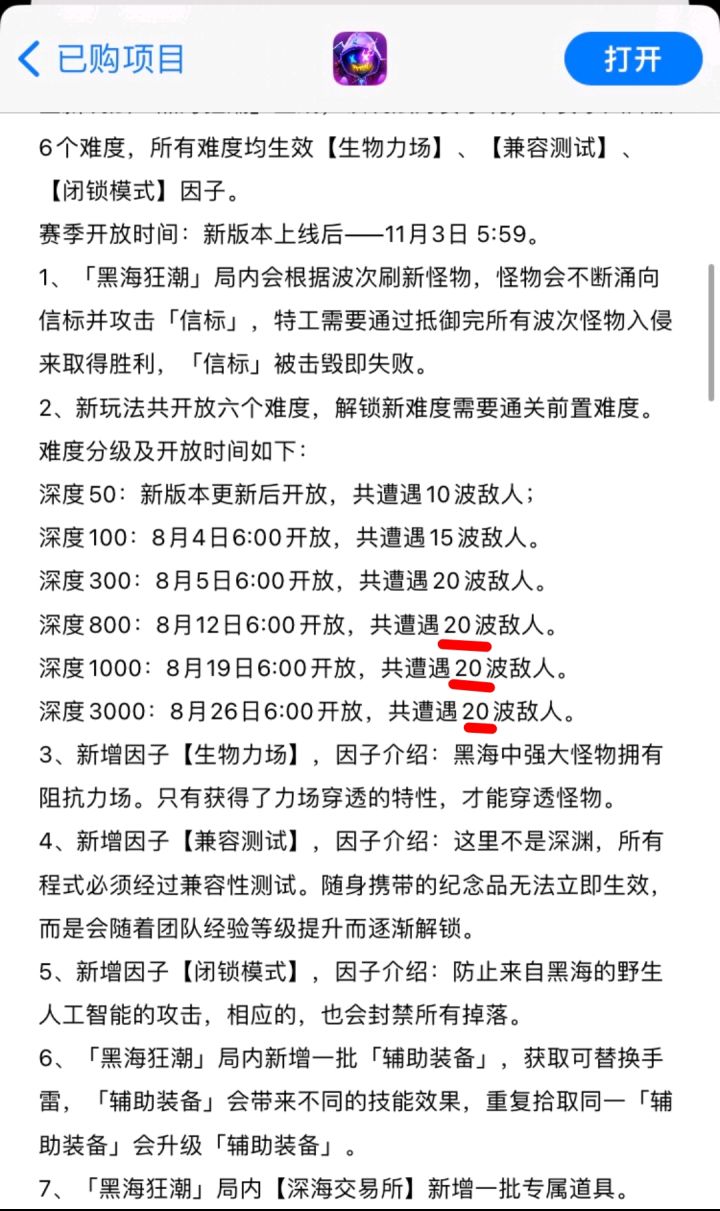 图为iOS端公告,tap端公告貌似没有标注各难度波数后面难度的流程不会再因波数拉长确实是好事但众所周知黑海的游戏体验问题不止于此卡顿尚未解决,优化还需努力(°Д°)/#霓虹深渊#霓虹深渊无限#霓虹深渊无限黑海狂潮#游戏资讯#游戏讨论