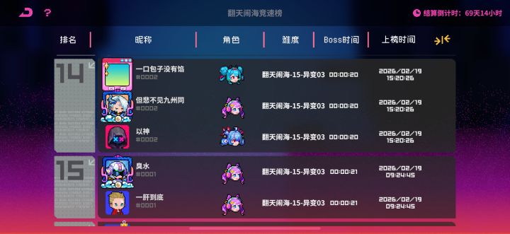 跟社长组队两把,咪咪人一把,打太快还不给上榜?咋滴,只有高于17秒才显示呗,意思就是太强了也是一种错误,直接秒boss被系统判定为挂呗?是多少秒就正常显示呗,很难吗?还只有打慢点才给上榜,限制我们这些佬发挥呗? #霓虹深渊无限黑海狂潮
