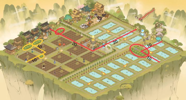 『图1-图3』52级到80级的布局,图1是夜间的,图2是白天的。图3是等级提升后工作区的调整,田地感觉已经不够用了『图4』工作区和多余的装饰都收起来了,田地也换了一边,还有红灵果的布局图,红线出红果,黄线出黄果,未修改的看评论33楼 『图5』90级更新布局,岛阔大了,主要还是臭水沟和灵果丛的调整『图6』正式的牛马布局,压缩了畜牧区『图7』新的红灵果布局图,神农鼎换了个位置,20x20的格子