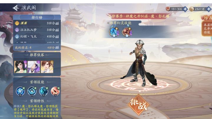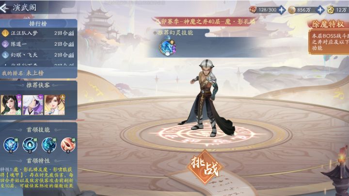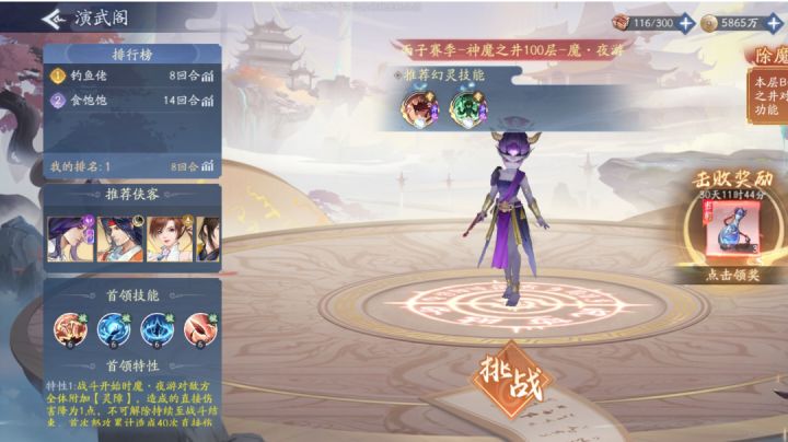 1、练度展示2、宠物展示3、通关视频四、答疑解惑 1、打法思路是什么? 答:【魂甲】:BOSS和小怪获得10层【魂甲】,存在时免疫伤害,每回合开始或我方攻击前会刷新至10层;【破击】:若我方侠客单次怒攻累计驱散≥12层魂甲,该侠客获得【破击】,无视【魂甲】免疫,持续到战斗结束。 2、boss速度 50层为97;60层为98;70层为100;80层为128;90层为156;100层